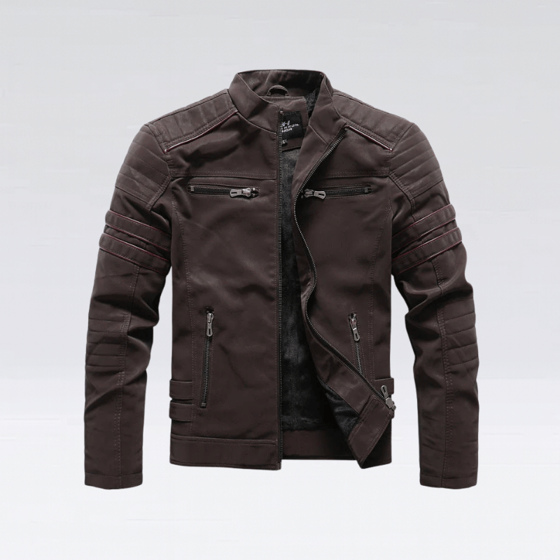 Trendig motorcykeljacka för den moderna mannen som kombinerar stil och funktionalitet. Gjord av premium konstläder med intrikata sömmar, erbjuder den både sofistikering och praktiska egenskaper för vardagsbruk, avslappnade utflykter och kvällsride.